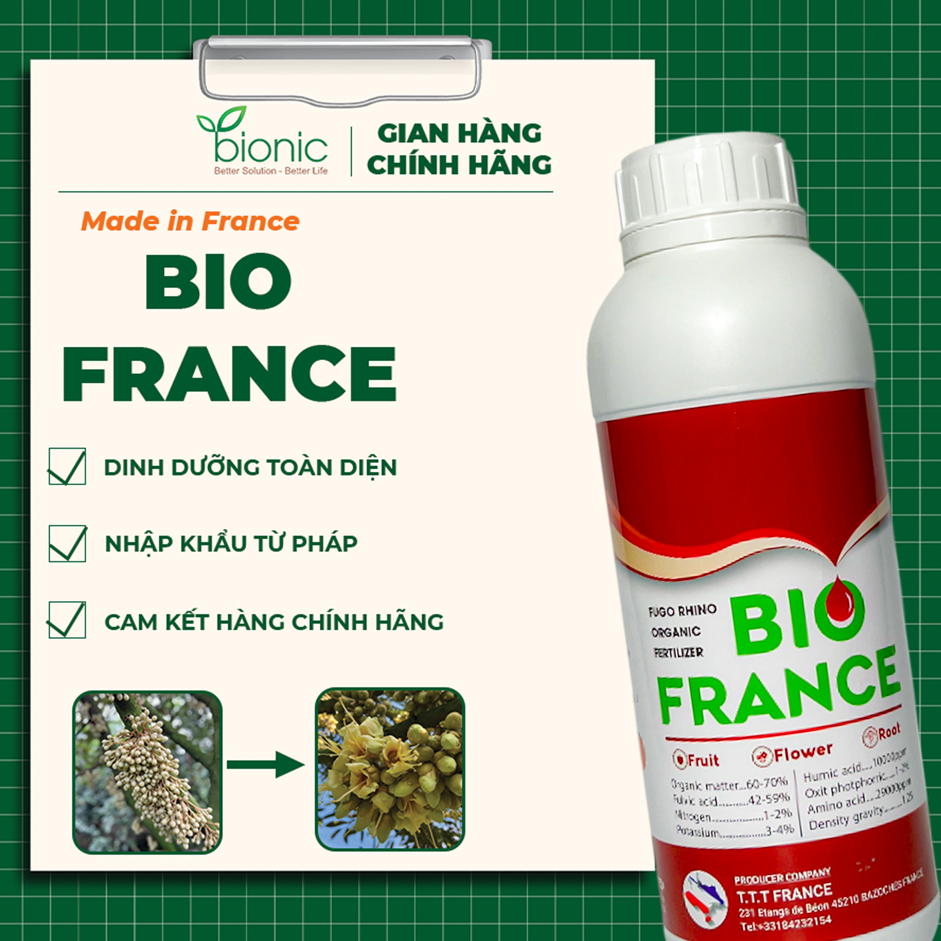 Phân bón hữu cơ BIO FRANCE là dòng phân bón hữu cơ cao cấp nhập khẩu trực tiếp từ Pháp, với thành phần chính là hữu cơ tinh khiết – giải pháp tối ưu giúp cây trồng phục hồi nhanh, phát triển mạnh, nuôi bông – dưỡng trái hiệu quả.