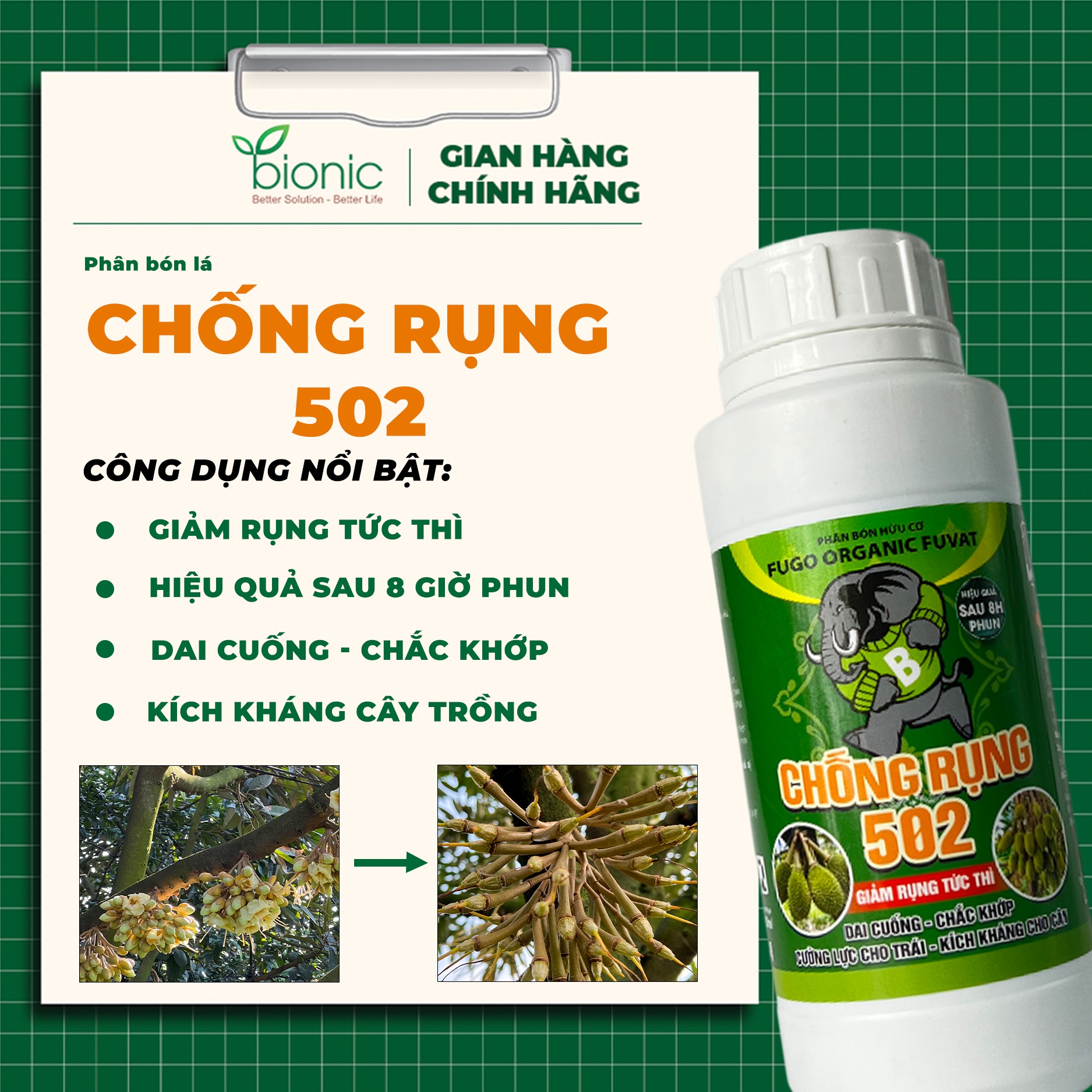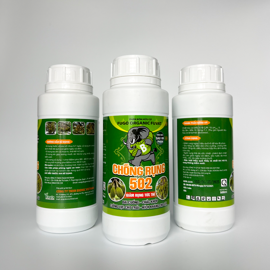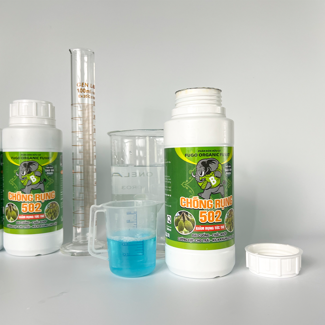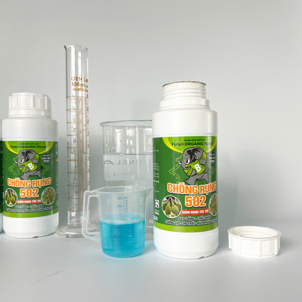 CHỐNG RỤNG 502 là phân bón lá chuyên dùng cho giai đoạn sầu riêng mang trái non, đặc biệt khi cây đang bị rụng trái không kiểm soát.