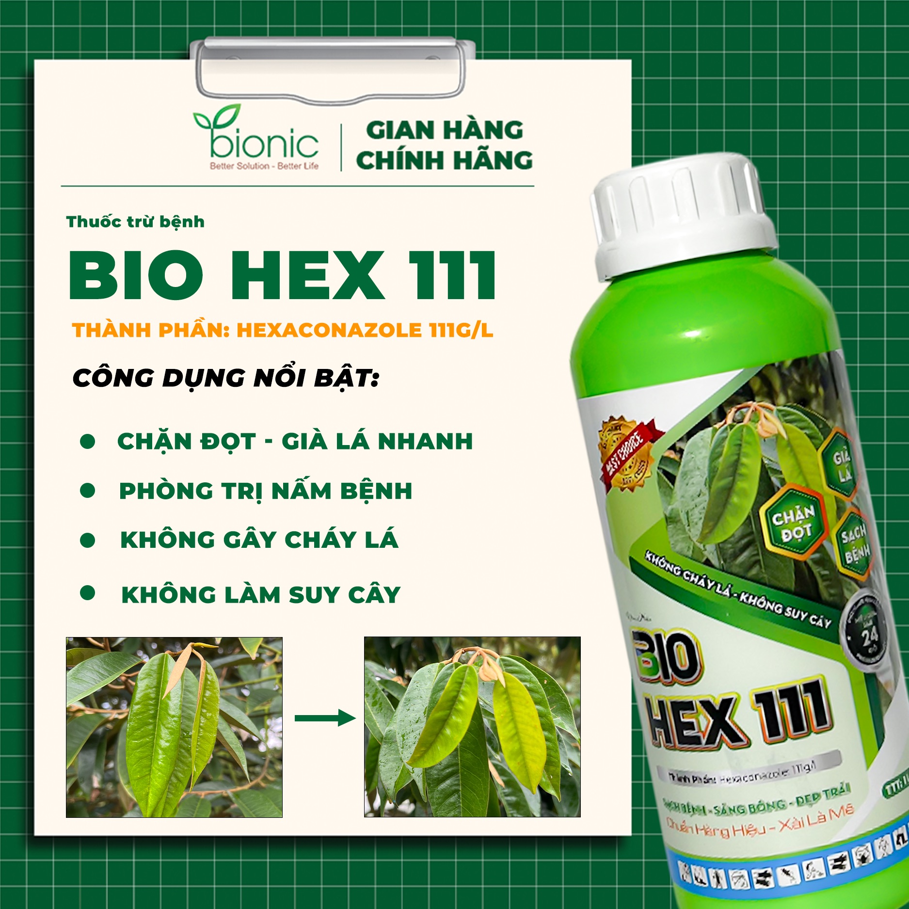 Thuốc trừ nấm BIO HEX 111 là một trong các sản phẩm phòng trị nấm. Thuốc có tác động nội hấp trừ được nhiều loại nấm bệnh như: khô vằn, mốc sương, đốm lá, rỉ sắt, thán thư, phấn trắng, bệnh giả sương mai, bệnh nấm hồng…. trên nhiều loại cây trồng khác nhau như lúa, rau màu cây ăn trái và cây công nghiệp. Ngoài ra, sản phẩm giúp CHẶN ĐỌT GIÀ LÁ NHANH kiểm soát đọt hiệu quả trong giai đoạn nuôi bông – nuôi trái sầu riêng